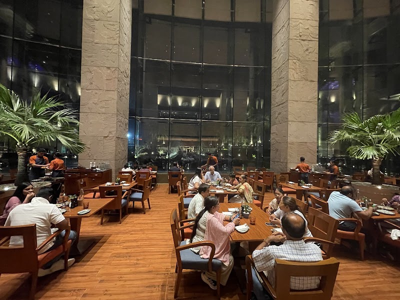 Hotel buffet restaurant with floor-to-ceiling windows & garden views serving Indian & global items.